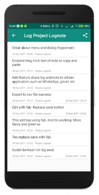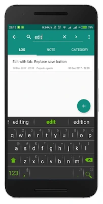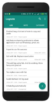 Feature: - write log. - write note with title and entry. - stamp the log and note with current date. - search on each log and note. - export log to csv file in your memory card. - share log and note to other app such as WhatsApp, Email, etc.