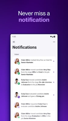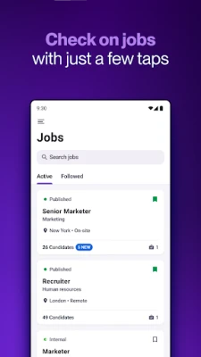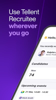 Use the Tellent Recruitee mobile app to: - Manage your to-do list with notifications for your upcoming and outstanding tasks - Follow your candidates' progress with pipeline overviews, evaluations, and team notes - Communicate with candidates by mailbox, their profile contact info, or one-click interviews