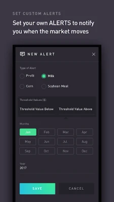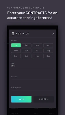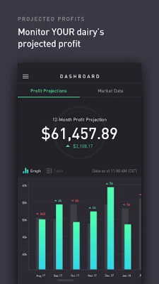 Enter a few basic details about your dairy and gain a clear view of your future financial outlook with a continuously updating twelve month profit projection. With a live feed from the Chicago Mercantile Exchange, the ZISK app lets you watch the markets for milk, corn, and soybean meal prices in the palm of your hand. You can set alerts so you’ll know right away when the market is moving. Also, enter your existing contracts into the app to see the most accurate view of your dairy’s profitability.